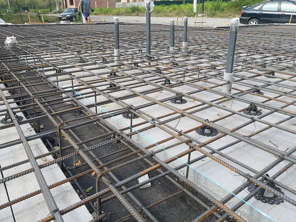Reinforcement is placed on spacers to achieve correct concrete cover. Hydronic heating pipes can be tied to the reinforcement in zones and circuits planned by heat‑loss calculations. Keep bends gentle, label circuits, and protect pipes during the pour.