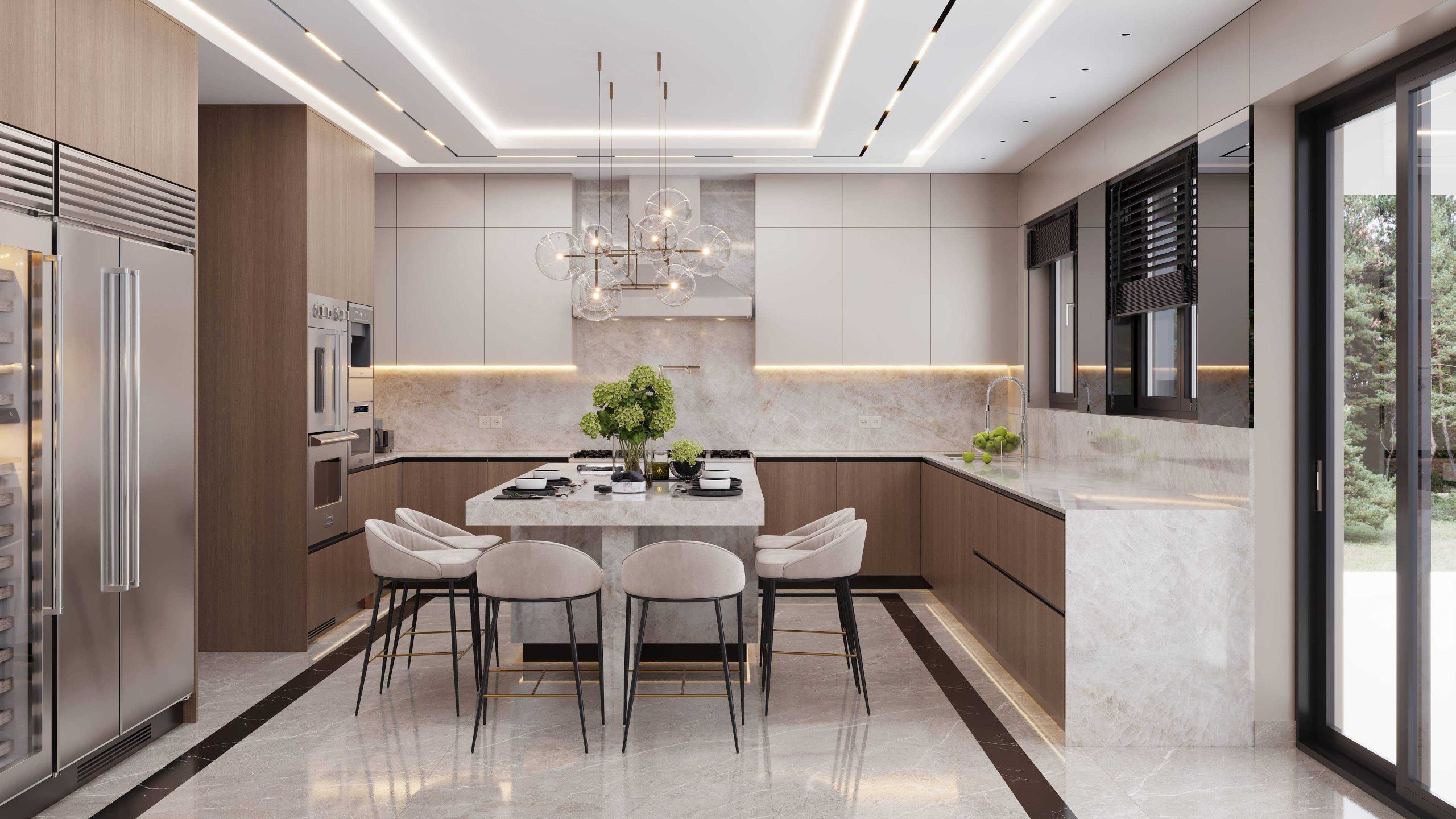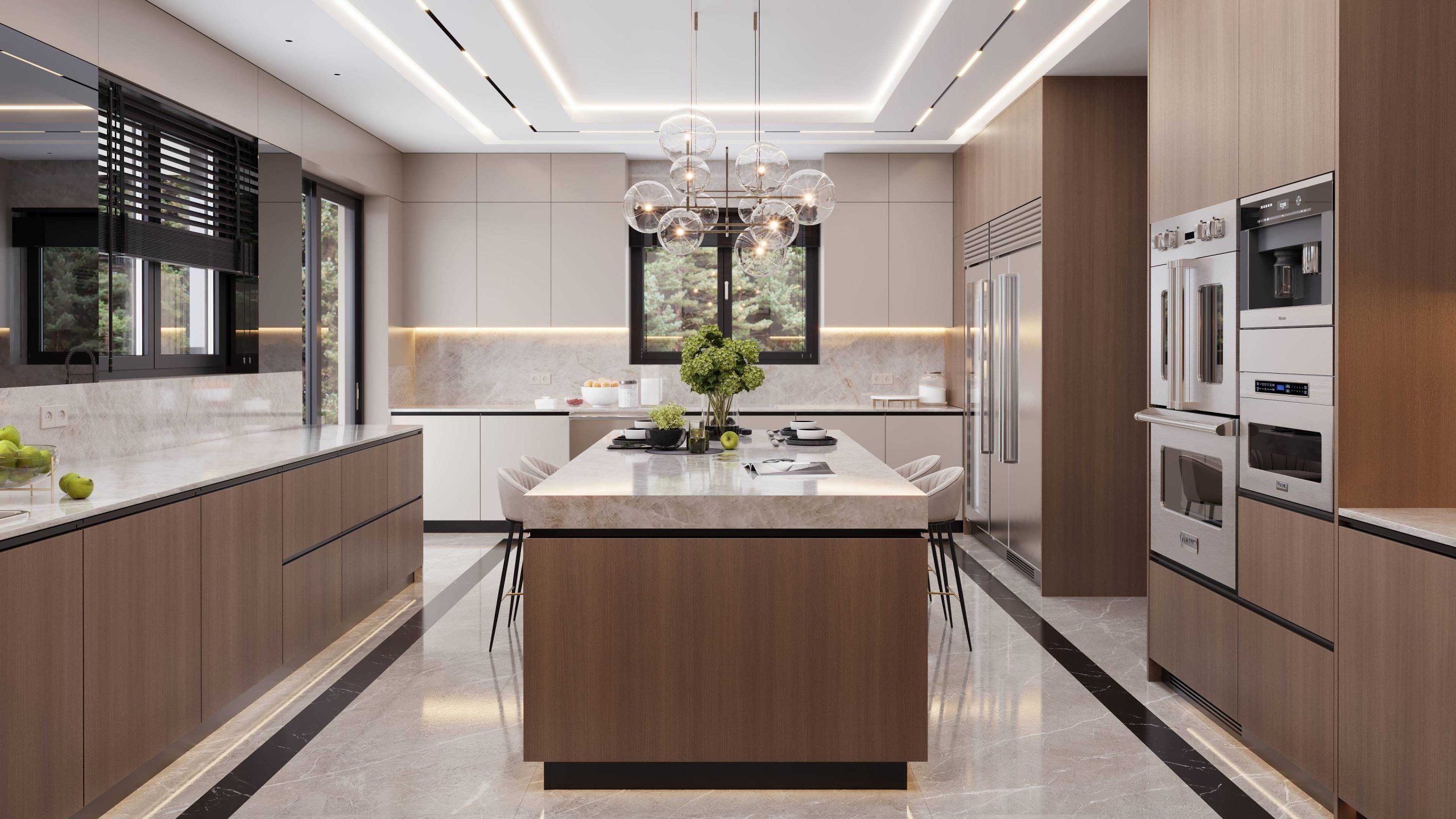 Our overall aesthetic balances contemporary minimal lines with subtle classic detailing. Wood textures add warmth and rhythm to the rooms. Meanwhile, stone surfaces introduce a quiet sense of permanence to the design. To create focal moments without overwhelming the composition, we added carefully chosen accents like brass-toned details and sculptural lighting. Consequently, this approach keeps the residence elegant, timeless, and easy to live in.