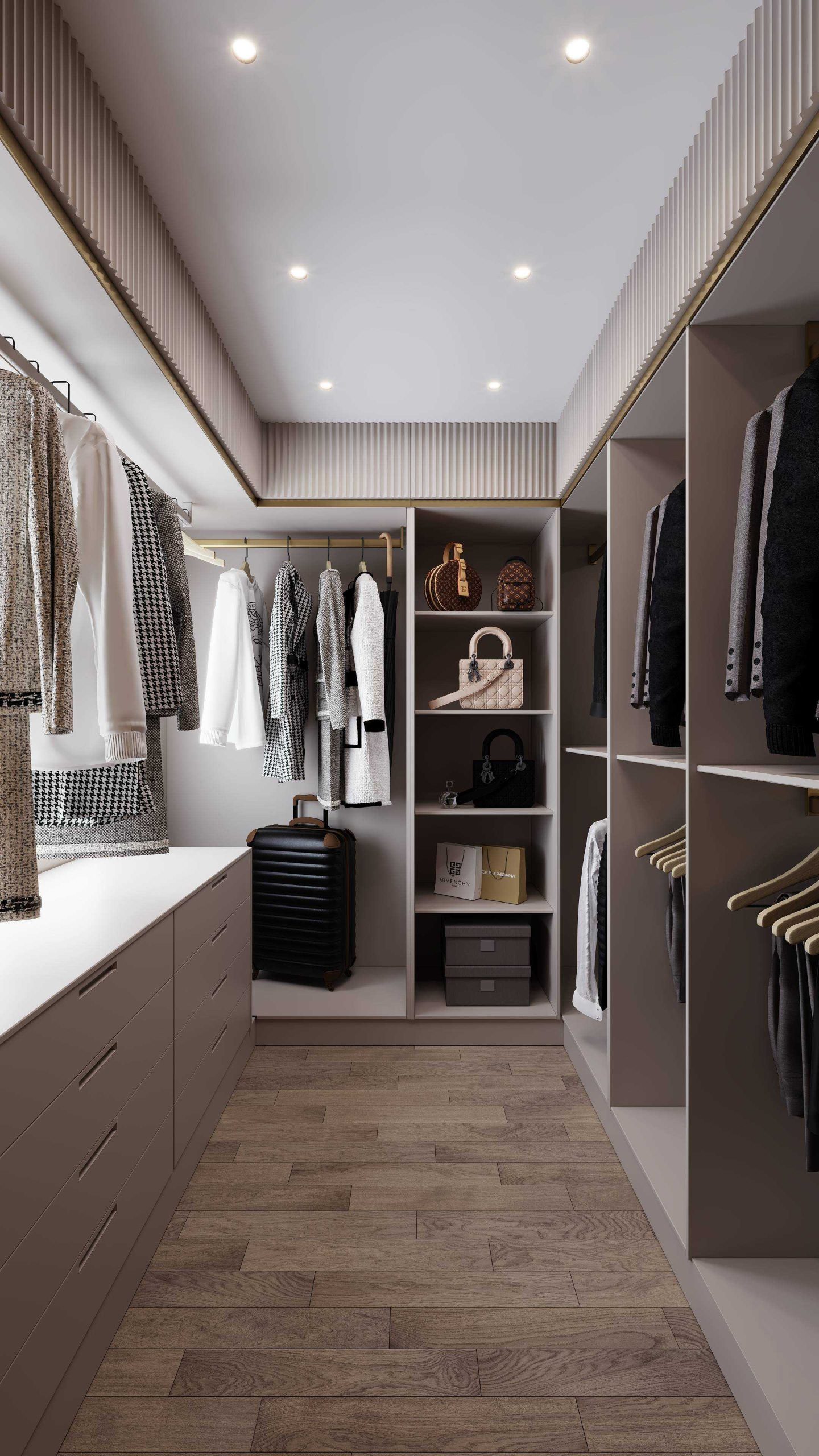 Storage is treated as an essential part of the architecture. For instance, the walk-in wardrobe features built-in systems with open shelves and drawer blocks. Warm integrated LEDs improve usability and make the space feel welcoming. Furthermore, fluted details at the upper perimeter add a subtle rhythm to the minimal volume.