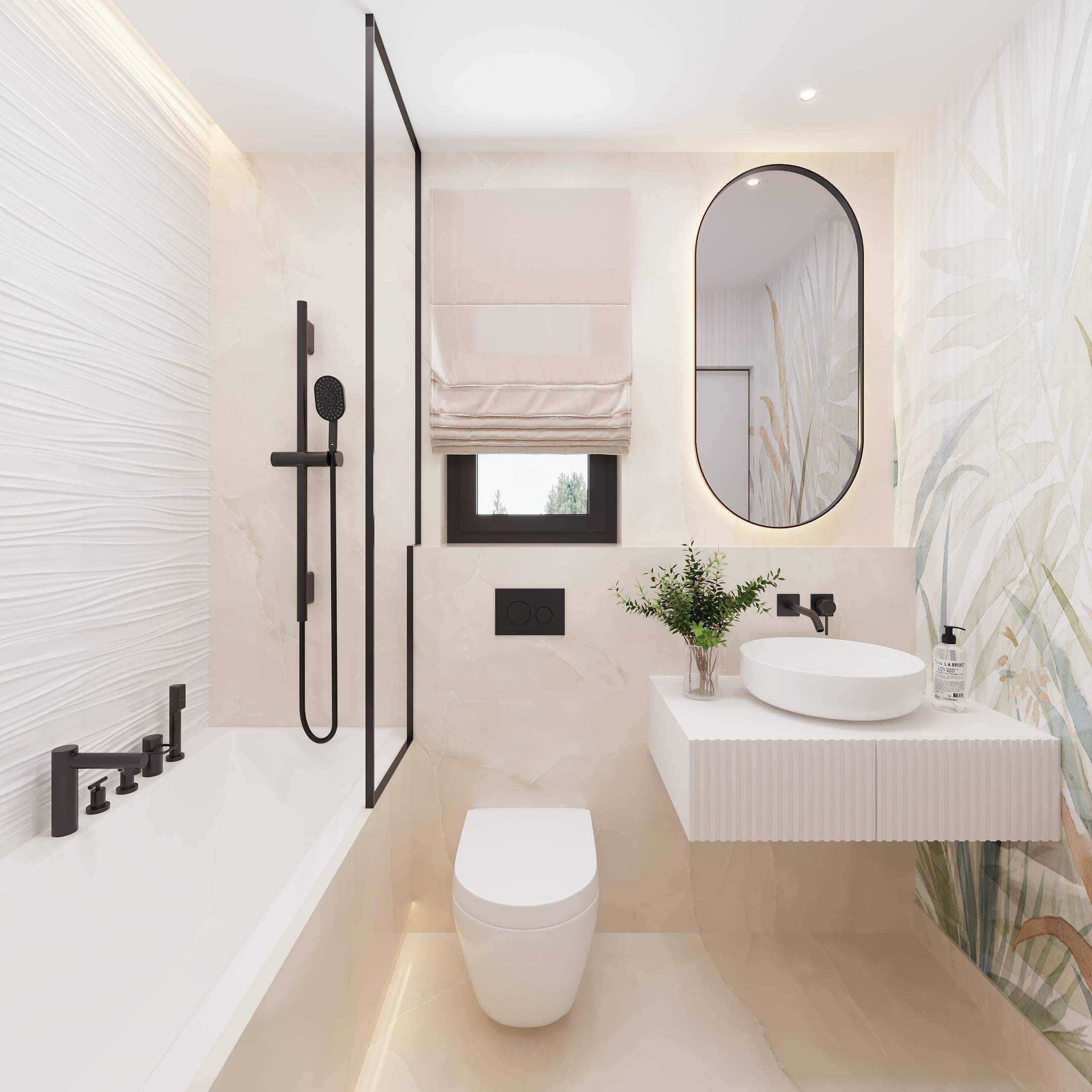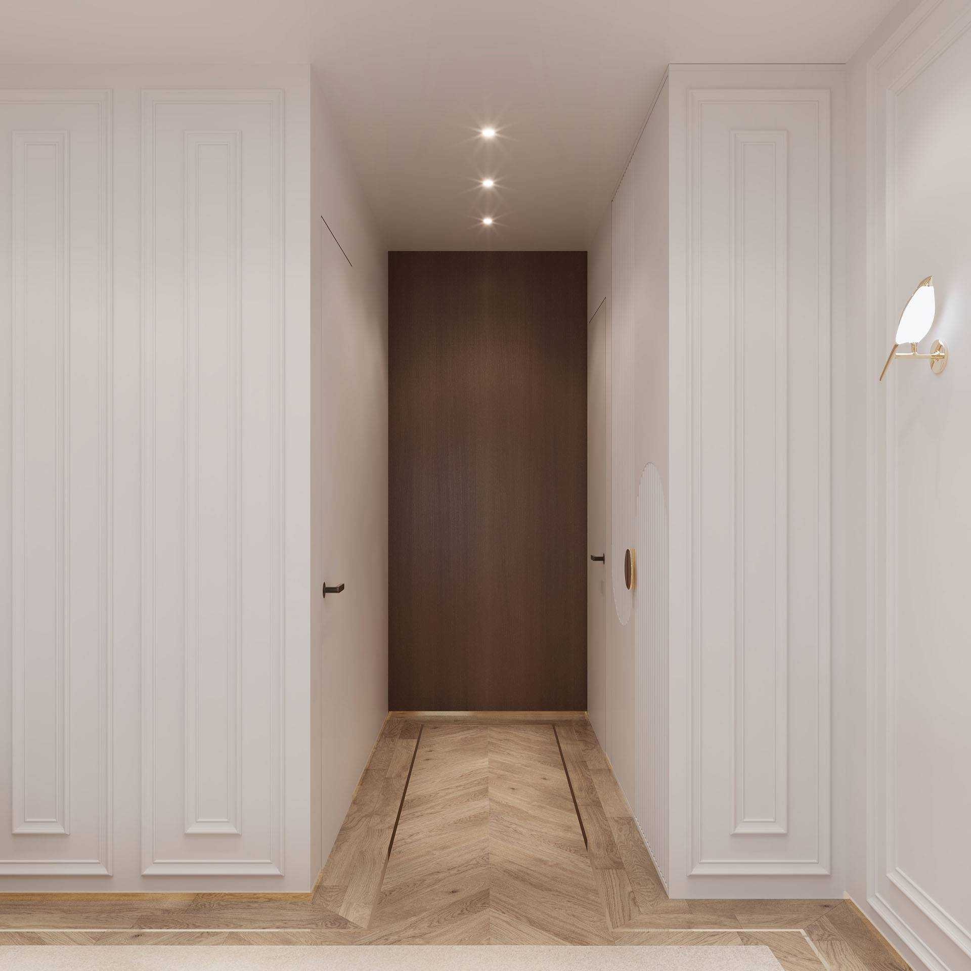 The bathroom design focuses on brightness and clean geometry. Light stone surfaces are paired with matte-black fixtures for crisp definition. Moreover, a floating vanity adds texture, while an oval backlit mirror softens the room. Moving into the hallway, the circulation spaces maintain the same design language. We used paneled built-ins and warm wood flooring laid in a herringbone pattern. This continuity is vital because it makes the residence feel cohesive from the first step inside.