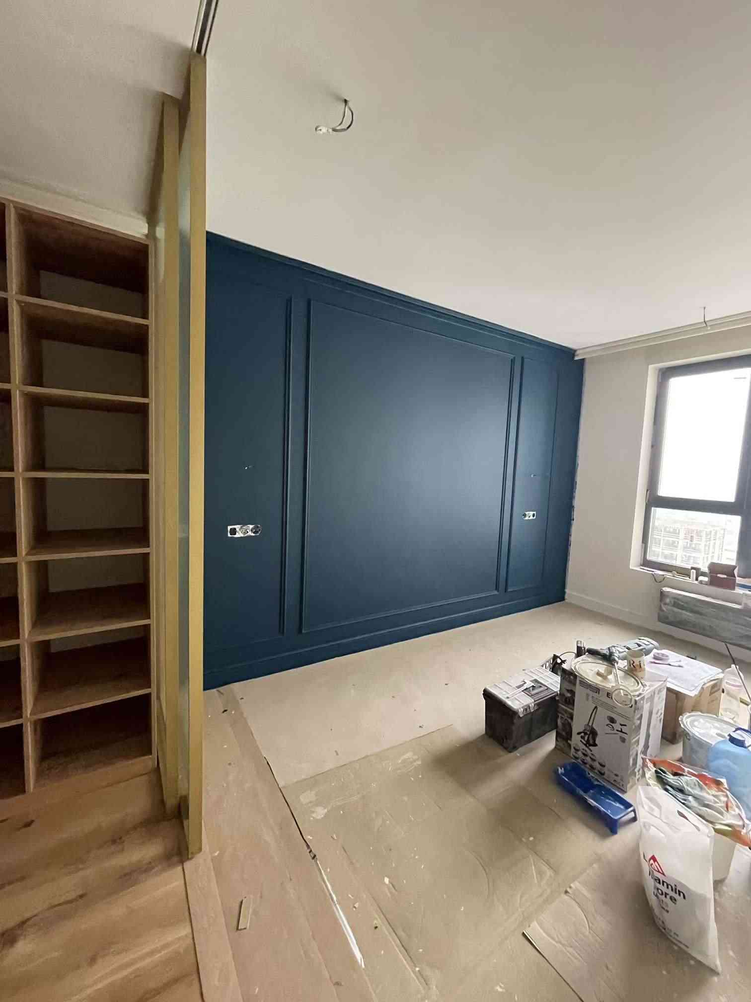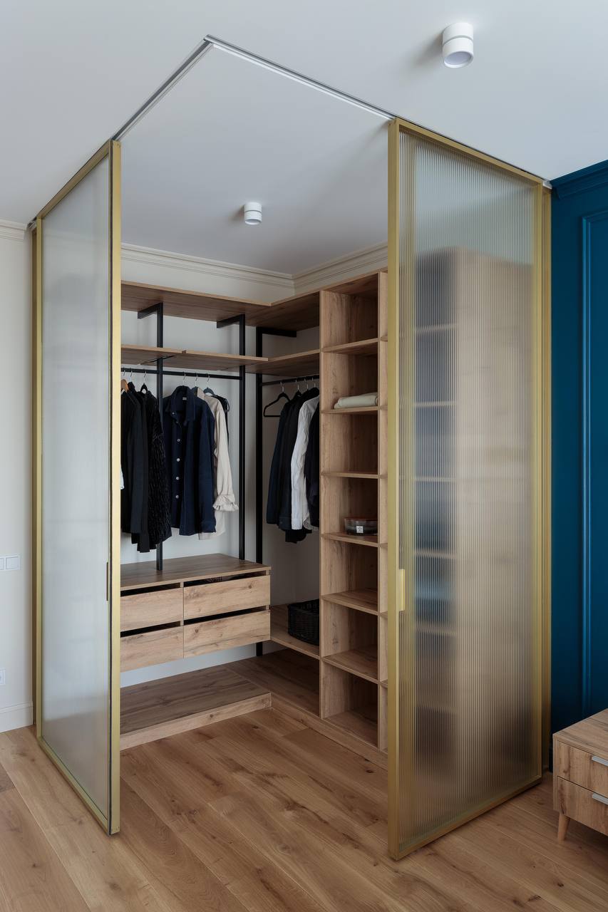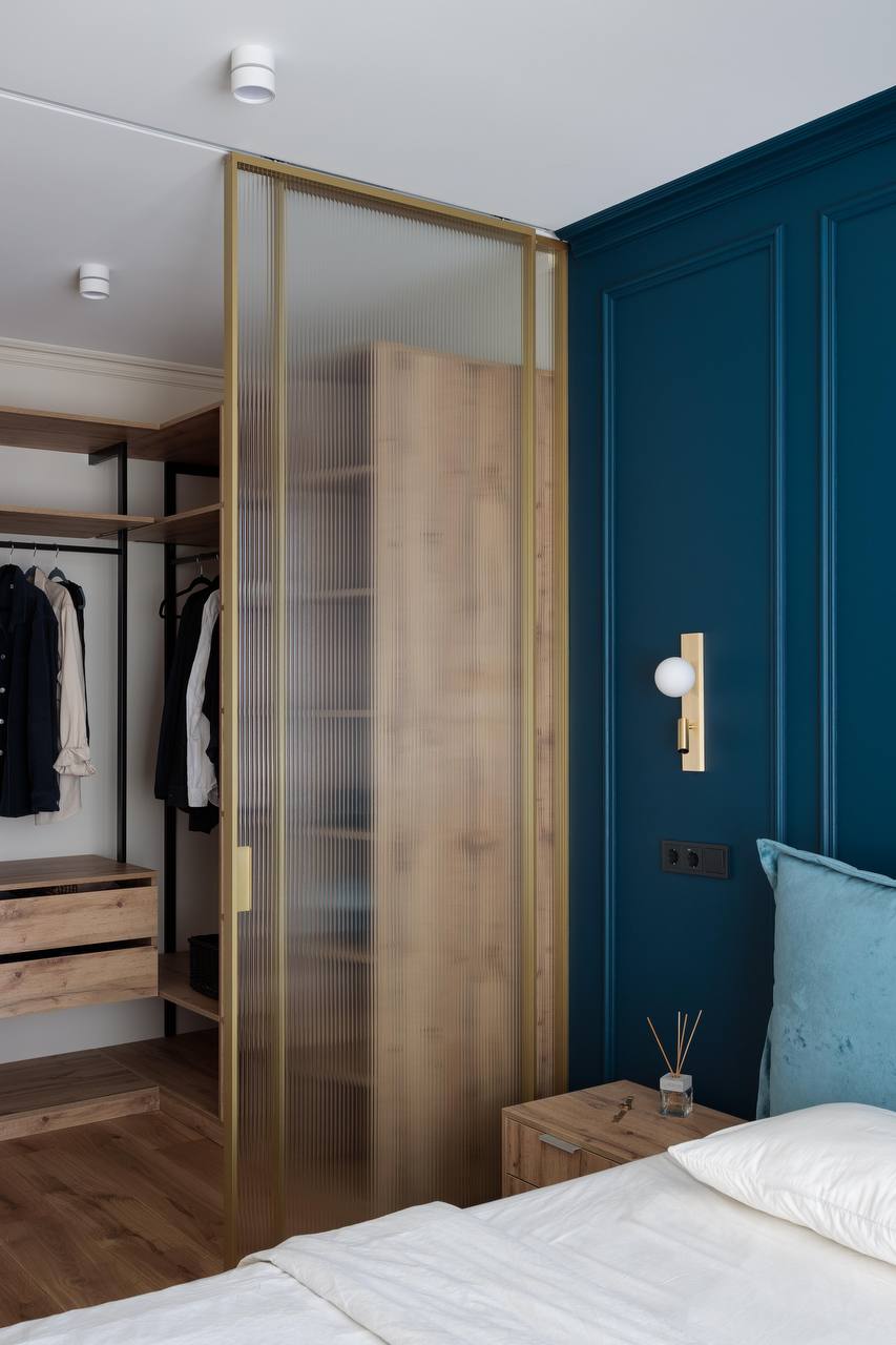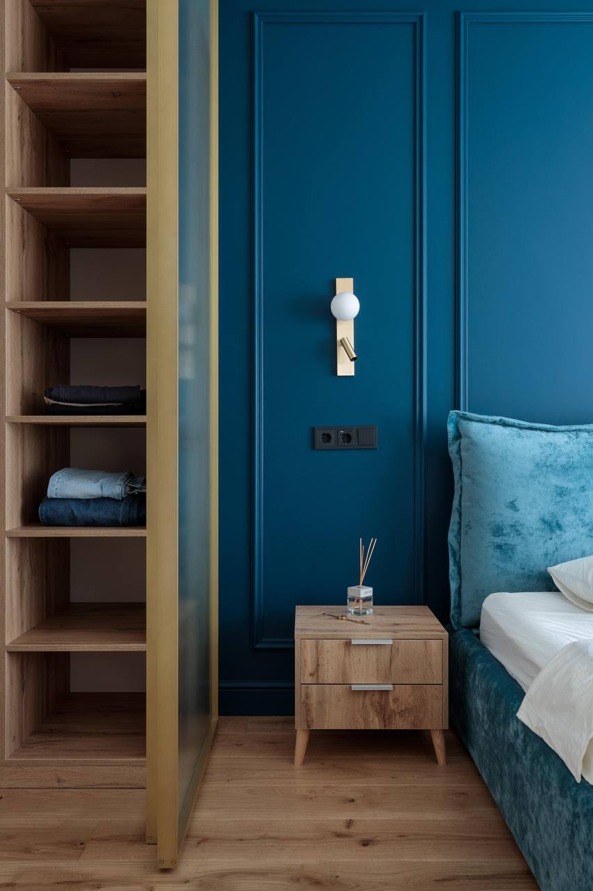 Bedroom interior with a deep blue accent wall and brass wall light, combined with warm wood finishes and a glass wardrobe partition framed in brass—balancing contrast and softness in a modern classic apartment design.