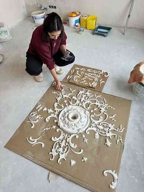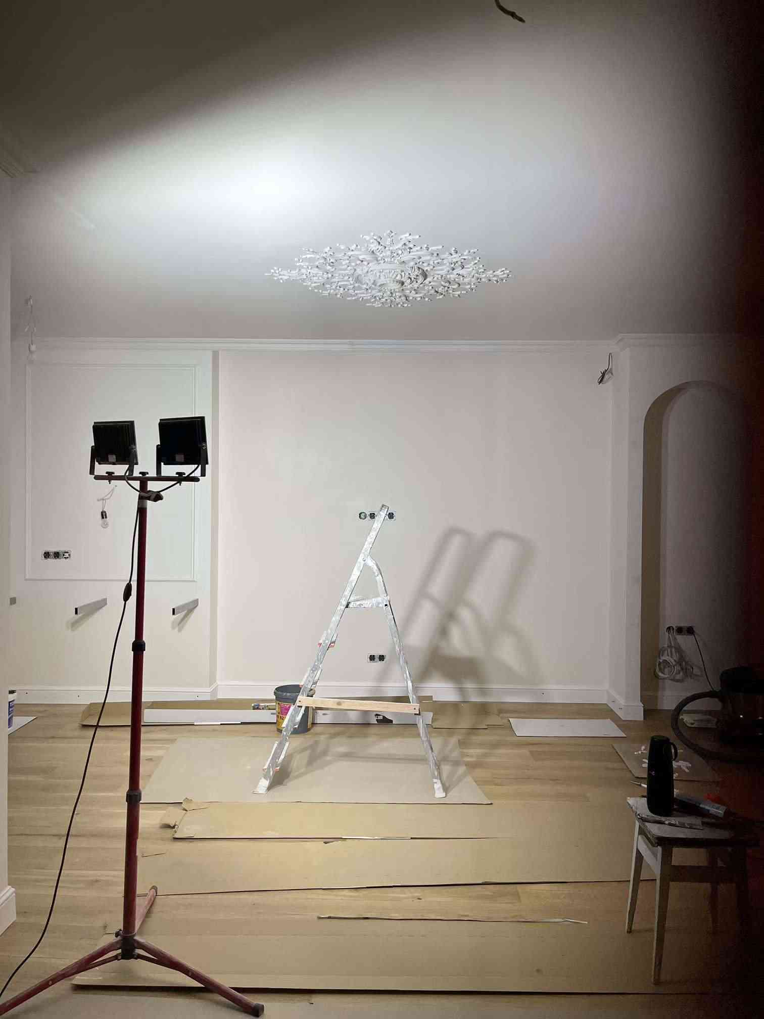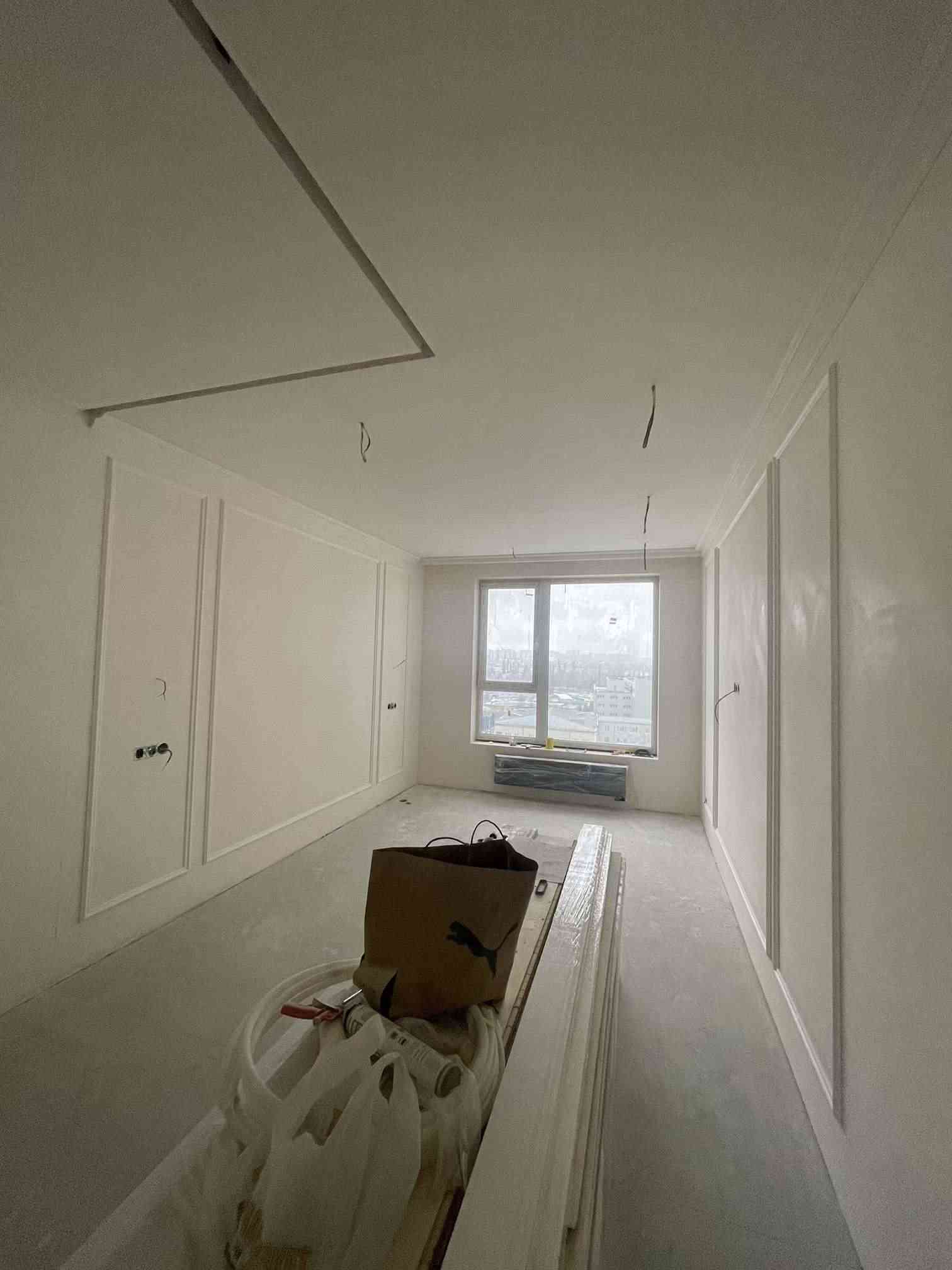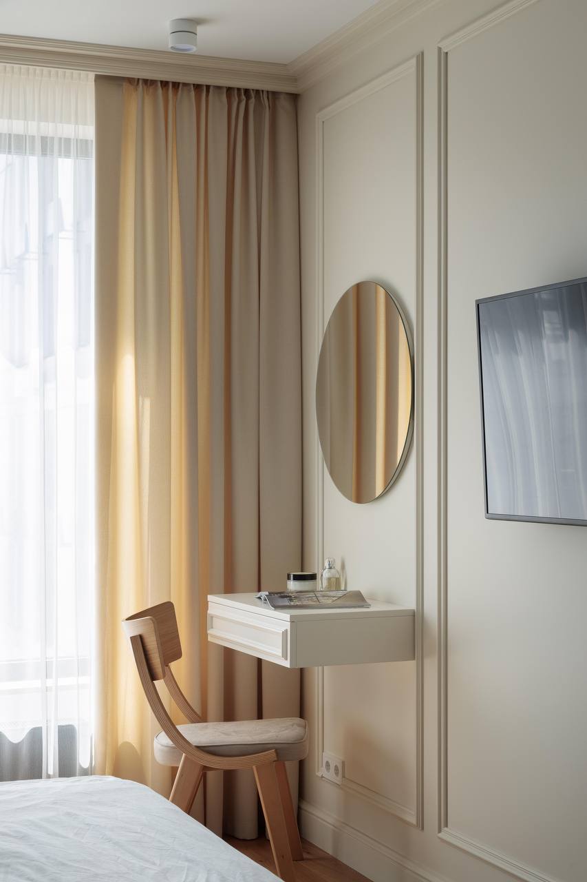 Mouldings are used throughout the apartment—an important wish of the client. As the founder of a famous Ukrainian jewelry brand, she values precision, craftsmanship, and refined accents. The interior design reflects that mindset through carefully aligned frames, elegant proportions, and a calm, light base palette that makes every detail feel intentional.