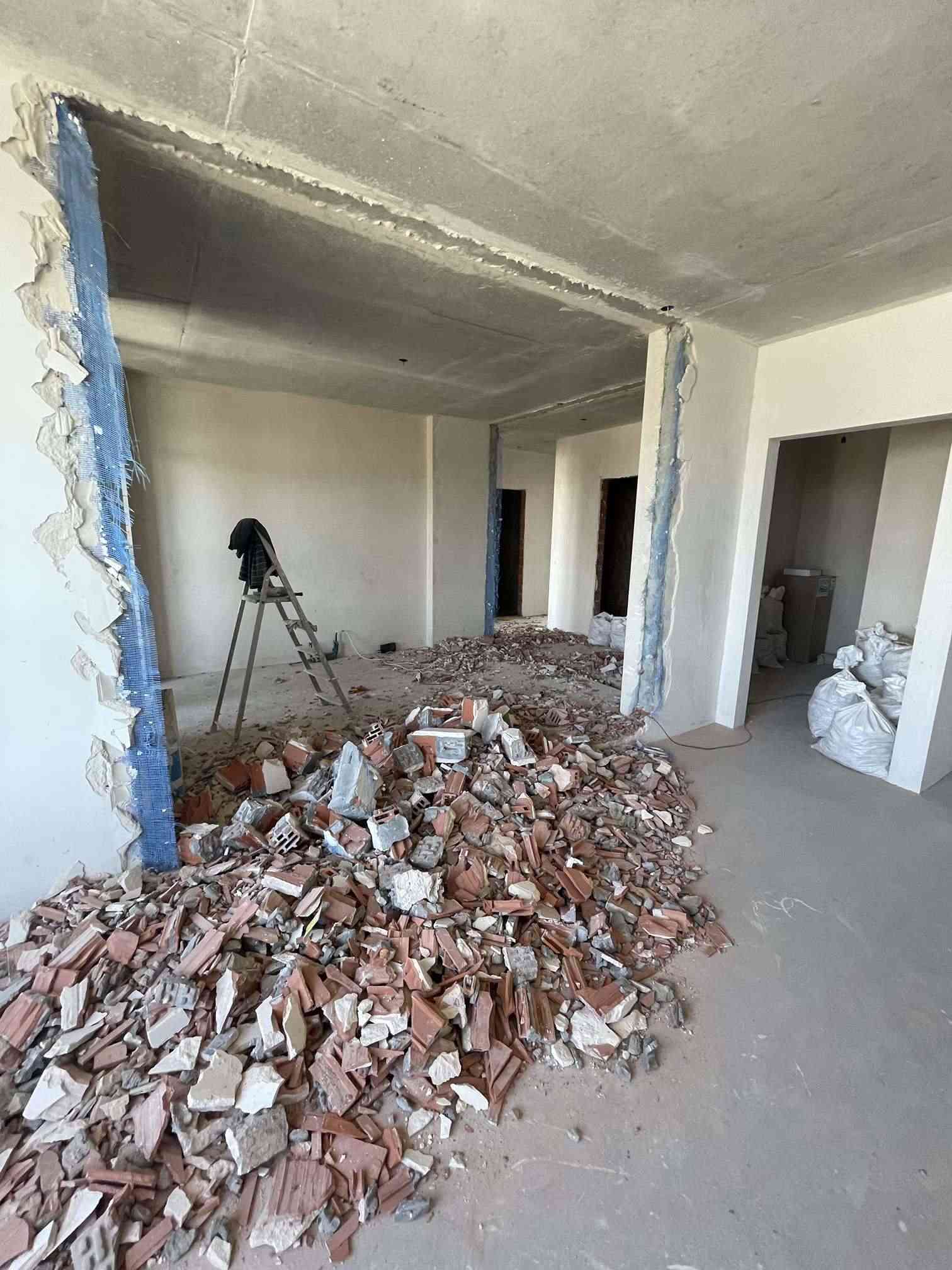 We removed one wall and merged two rooms to create a generous open-plan main hall. The children’s room and the master bedroom remained separate. By integrating the corridor, the hall, and the former room area, we achieved a brighter, more fluid living space with cleaner circulation and a stronger sense of volume—an essential improvement for an apartment renovation in a city center context.
